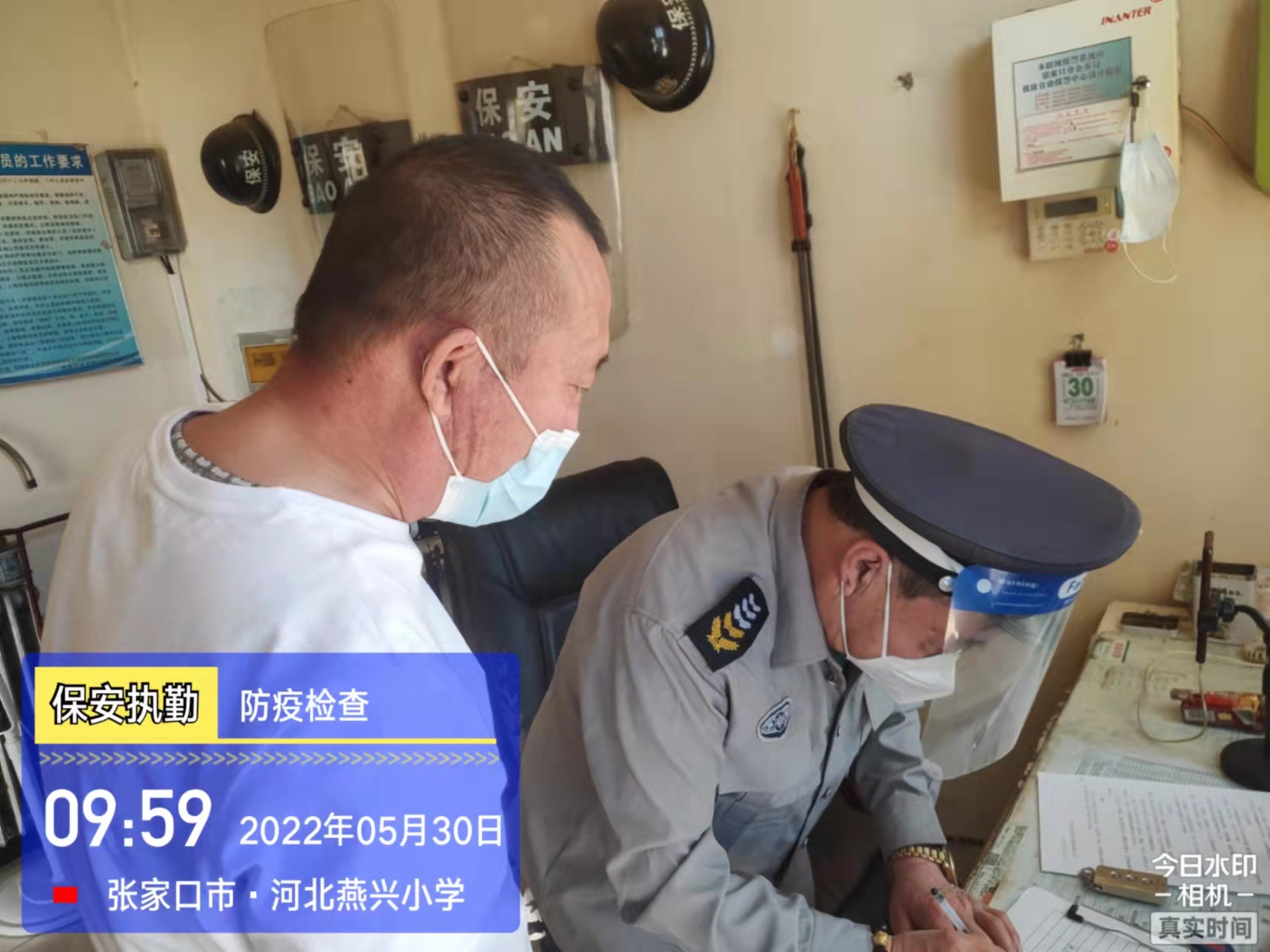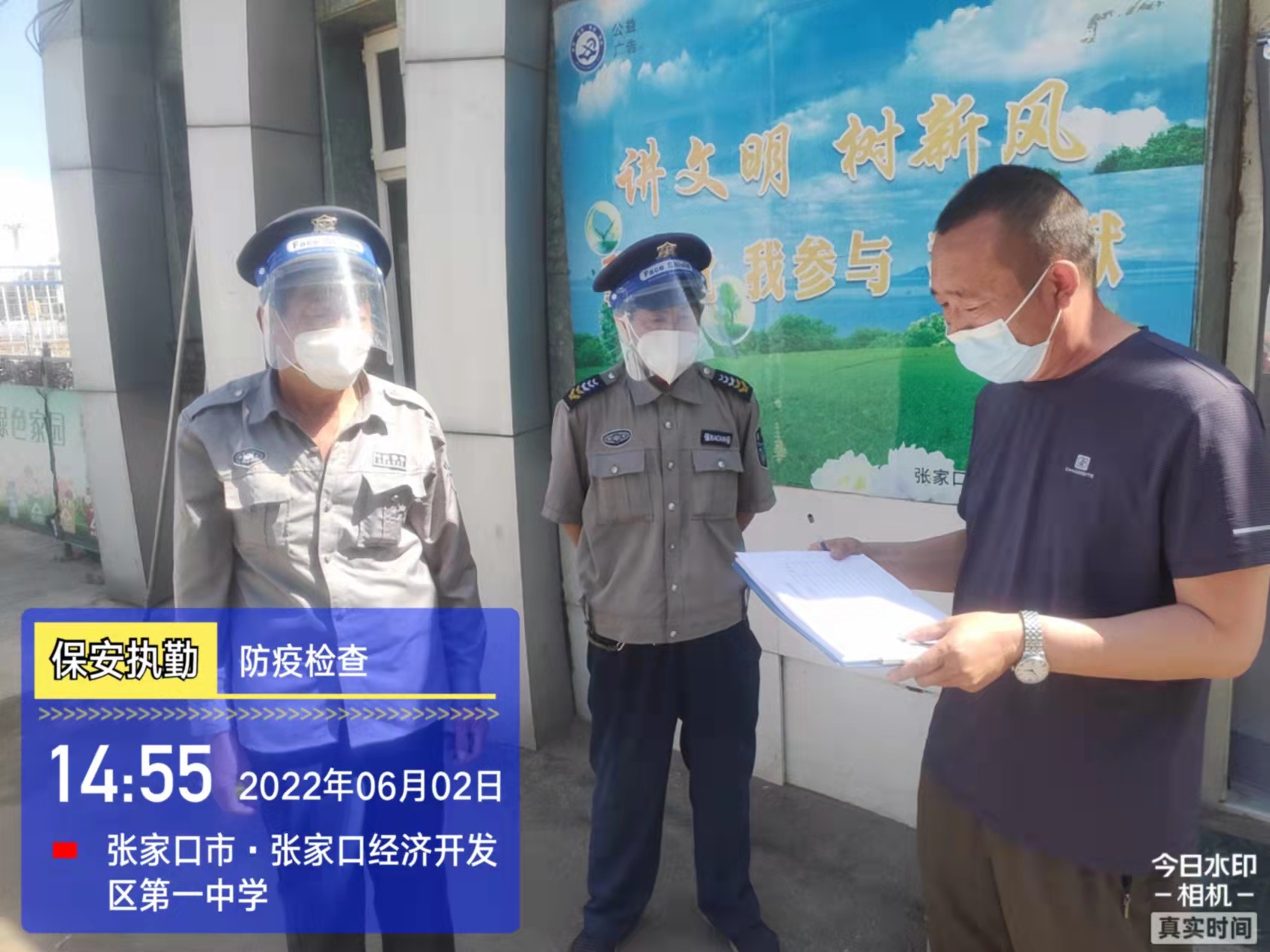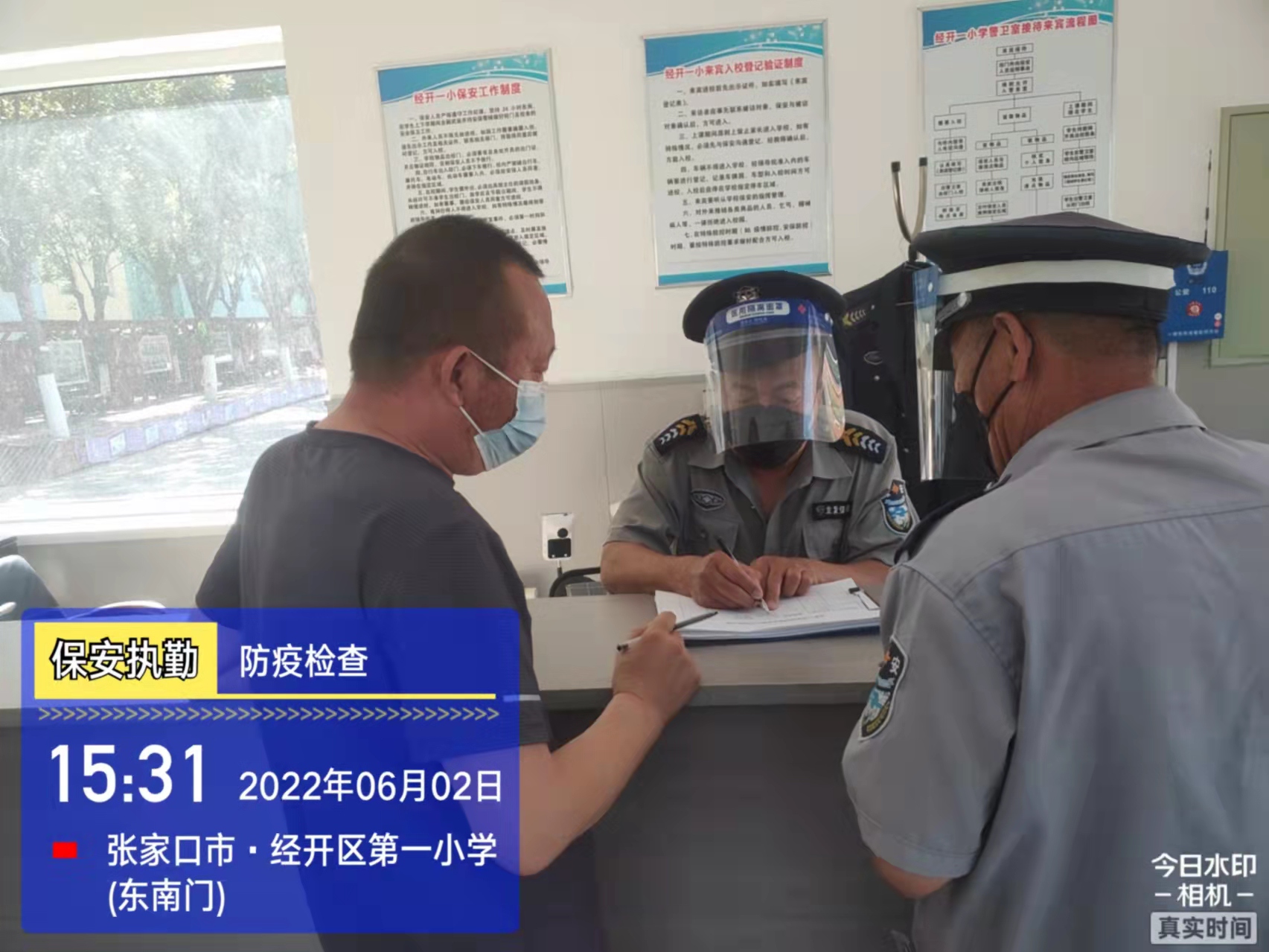 會后,我公司迅速召開“疫情期間學(xué)校門衛(wèi)安全防控工作要求”的會議,制定了校園安全防疫規(guī)定:疫情防控期間,校園保安隊(duì)員必須穿制服,規(guī)范佩戴“三件套”(防護(hù)隔離面罩、N95口罩、一次性PVC手套);進(jìn)出校園的師生必須測量體溫,外來人員需登記、測溫、掃碼(幸福張家口,呈綠碼)、且持7日內(nèi)核酸陰性檢測結(jié)果;保安室需保持干凈整潔,物品擺放有序,勤開窗通風(fēng),定期噴灑消毒藥水。為此,公司特成立校園防疫檢查小組,由副經(jīng)理帶隊(duì),協(xié)同主管大隊(duì)長對經(jīng)開區(qū)所有中小學(xué)校安保崗位進(jìn)行防疫工作檢查,檢查期間,發(fā)現(xiàn)問題,現(xiàn)場處理,并及時(shí)與校方領(lǐng)導(dǎo)溝通,杜絕同樣問題再次出現(xiàn),確保校園防疫安保工作萬無一失,為各校師生鑄就一道安全防線!